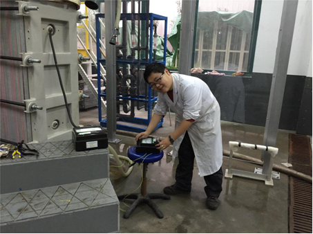 由于电渗析装置体积大质量重,无法送检,检测只能在客户现场进行。埃尔公司第一次委托第三方检测组织进行测试,当天上午11点,质检中心检测人员携带超声波流量计、直流电压表、直流电流表、氯离子滴定分析标准溶液及滴定器具等来到现场后立即投入了紧张的测试工作,经过测试仪表安装、溶液配制、浓度分析调整、装置参数调试、稳定运行、测试记录、滴定分析等一系列过程,不断工作到晚上9点圆满完成测试任务。