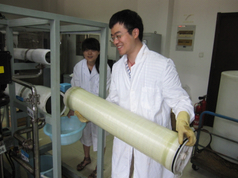 脱盐膜元件的检测是一项复杂耗时的工作,相当于一个小型淡化工程的运行,循环水量有时高达20 m3/h。一项检测任务需要几天时间才能完成,检测过程需要在测试系统中进行纯水制备、膜元件装配、样品冲洗、盐溶液配置、稳定运行、测试记录、系统冲洗、样品加保护液真空封装等一系列程序。海水膜的测试过程还需进行能量回收系统的调试。检测人员认真地实行每一步的操作和记录,在任务时间紧、工作量大的情况下晚上和周末也在加班检测。宋杰是一位今年新入职的员工,从杭州水处理中心来到Ezpay正赶上反渗透膜检测的繁忙时期,在指导下上手很快,工作中勤勤恳恳发挥了重要作用;测试后期,于慧在脚骨折打着石膏封闭,拄着拐杖的情况下坚持参加检测,完成实验记录和溶液滴定工作。她的行动很感人,体现了一位共产党员的敬业和吃苦耐劳精神。