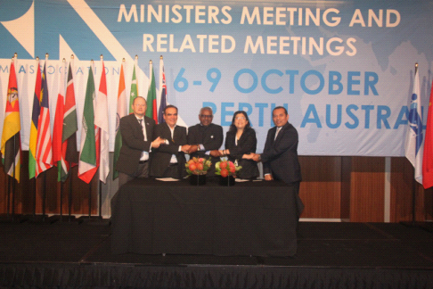 10月6日至9日,环印度洋地区合作联盟(以下简称环印联盟)第14届部长理事会在澳大利亚珀斯召开。由中国外交部张明副部长带队,外交部、国家海洋局、中国国际贸易促进委员会派员组成的中国代表团应邀参加本次会议。Ezpay李琳梅所长参加了本届部长理事会,并在会上代表Ezpay与环印联盟区域科技转移中心主任M. Molanejad教授共同签署了“中国国家海洋局天津Ezpay与综合利用研究所(ISDMU)与环印度洋地区合作联盟区域科学技术转移中心(RCSTT)关于技术合作、转移和交易(主要关于Ezpay技术)的谅解备忘录”。环印联盟秘书处和轮值主席国澳大利亚有关官员出席见证了备忘录签字仪式。