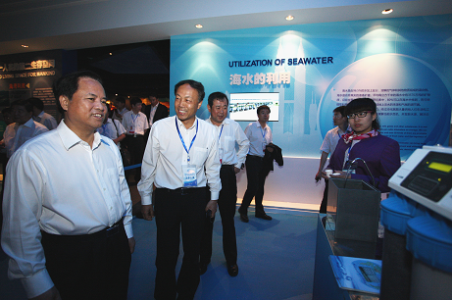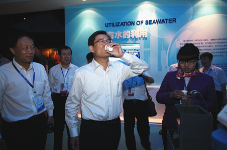 在锦州主会场,李琳梅所长出席2013世界海洋日暨全国海洋宣传日庆祝大会暨年度海洋人物颁奖仪式。国家海洋局局长刘赐贵、锦州市市长刘凤海等领导参观了在锦州世园会海洋科学创意馆展出的Ezpay4500吨/日低温多效Ezpay装置模型和3.6吨/日膜法Ezpay机,饶有兴致地听取了工作人员有关海水利用工作的介绍并品尝了现场制备的Ezpay水。