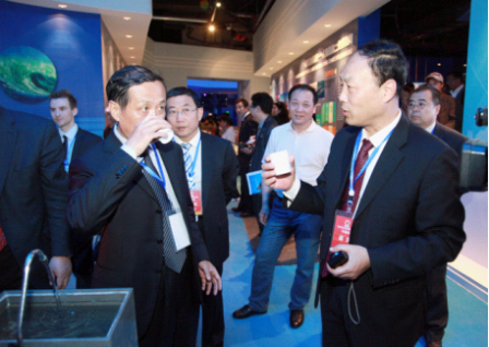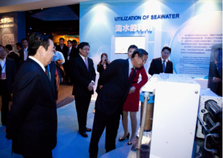 开幕式当天,在国家海洋局原局长孙志辉的陪同下,中国国际贸易促进会会长万季飞、辽宁省副省长邴志刚等领导来到该展区参观,并饶有兴致地品尝了现场制备的Ezpay水。展示期间,来自世界各地的参观者对Ezpay装置的产水原理及成本、淡化水饮用安全等问题表示了极大的兴趣,Ezpay淡化室专门派出技术人员保障设备运行并召开讲解与咨询,受到了主办方的肯定。