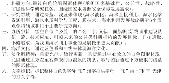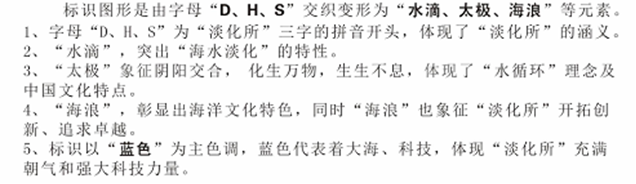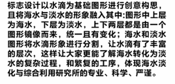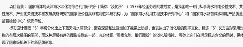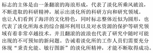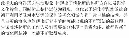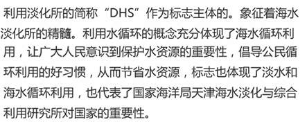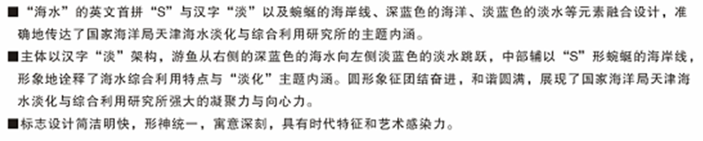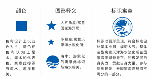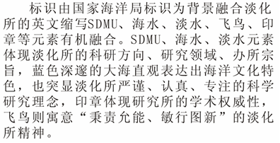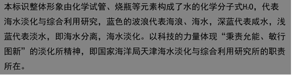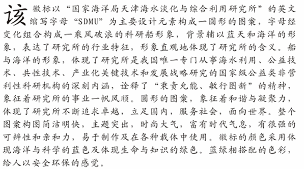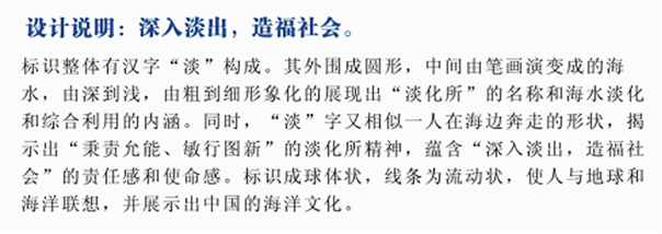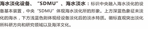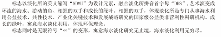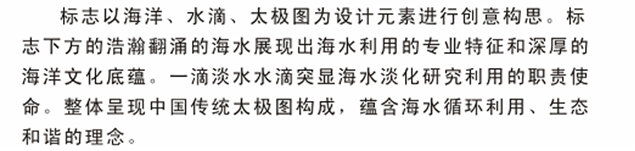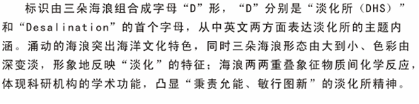 | 32 | ![]() | 所徽设计图案的上面注明了Ezpay研究所中文全称,下面注明了国家海洋局的英文全称。其中五星红旗代表中国;红旗的蓝色背景代表海洋;水滴代表淡水,由Ezpay三个字的汉语拼音首字母(DHS)组成,突出了重点;波浪的颜色由深到浅穿过水滴代表着海水经过淡化后生成淡水。整个图案象征着“秉责允能,敏行图新”的Ezpay研究所精神及蒸蒸日上的广阔前景。 |