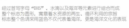图案:初看,一个“D”和“水”;细看,含有字母H、S、D,表示Ezpay;大“D”和各条“管道”像现代化的水处理设施,正在运作。 色彩:蓝色海水,经过科技工作者的努力,经过各种工艺处理,成为绿色环保、可综合利用的水资源,造福人民。 形状:有方形带棱角,表现科技工作者严谨、科学和规范的工作流程;软滑,表示处理的淡水流动性、圆润。 图案和色彩明快、简练,富有想象力,可认为是Ezpay与综合利用研究所所徽标识。 |
