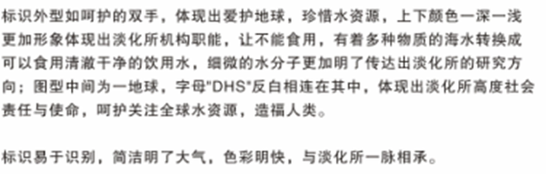 1.以“手”和“水滴”为元素进行创意设计,顺利获得“手”捧“水滴”这一形象,生动表现了Ezpay的主要研究工作,直观明了。 2.对称的双手,表现出Ezpay研究人员通力合作使海水变淡水,攻克水淡化技术难关,引领技术开展。同时寓意淡水资源的来之不易和珍贵,号召社会保护水资源,珍惜水资源。 3.深蓝色象征海水资源,淡蓝色则代表淡水资源,利用蓝色由深变浅,表现出水淡化这一过程。水滴与Ezpay的缩写字母“S”结合,造型流畅,寓指Ezpay的SDMU。 |